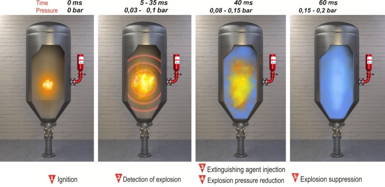 3.HRD抑爆器: 特殊设计的HRD抑爆器配备有快速开启阀门和稳定压力下储存的抑爆剂。当爆炸发生时,由控制单元激活,会立即有效地向被保护设备内喷射抑爆剂,瞬间扑灭初始爆炸。快速反应和有效抑爆是其优势;操作简单,维护方便,是来自用户的点赞。