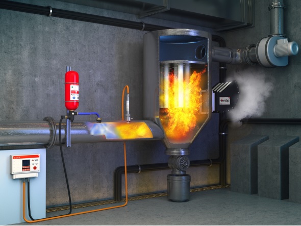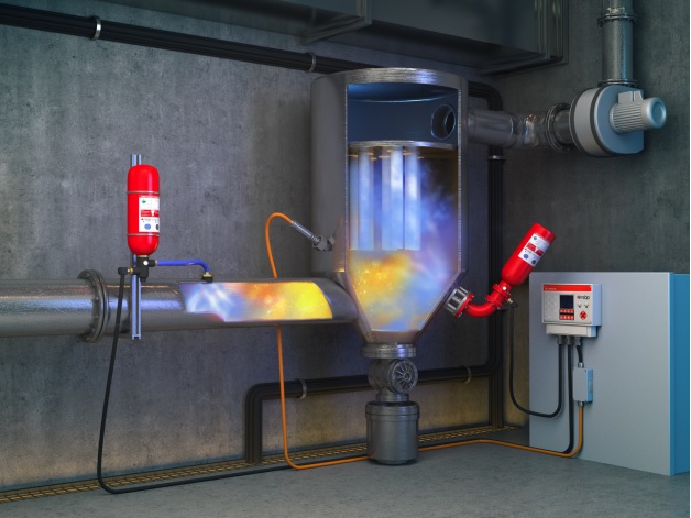 3.HRD化学隔爆器(同HRD化学抑爆器): 特殊设计的HRD隔爆器配备有快速开启阀门和稳定压力下储存的隔爆剂。当爆炸发生时,由控制单元激活,会立即有效地向被保护管道内喷射抑爆剂,瞬间吸收爆炸火焰。化学隔爆只能有效熄灭爆炸火焰,并不能有效阻止爆炸压力。